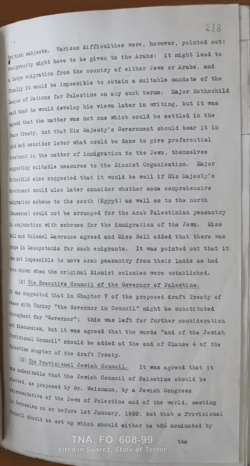 Major Rothschild also suggested that it would be well if His Majesty's Government would also later consider whether some comprehensive emigration scheme to the South (Egypt) as well as to the north (Damascus) could not be arranged for the Arab Palestinian peasantry in conjunction with schemes for the immigration of the Jews.