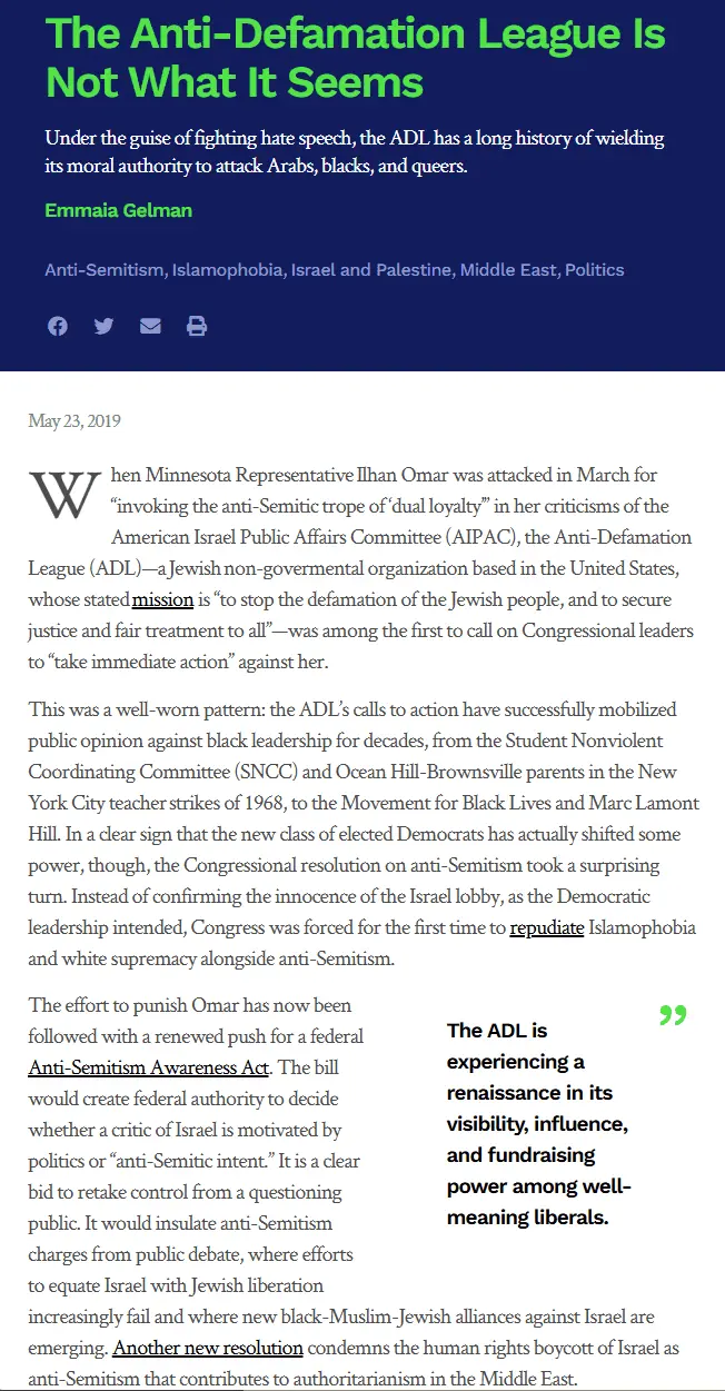 crazy how that article says (at least in the part I can see) nothing problematic about the ADL. But I guess "Jewish voices" only matter when they support your position.That a racist right wing Zionist lobby group is attacking a vocal critic of Zionsim and its crimes, surprises no one,. least of all me. Here's a little about them that you obviously don't know about, oh and its written by a Jew: