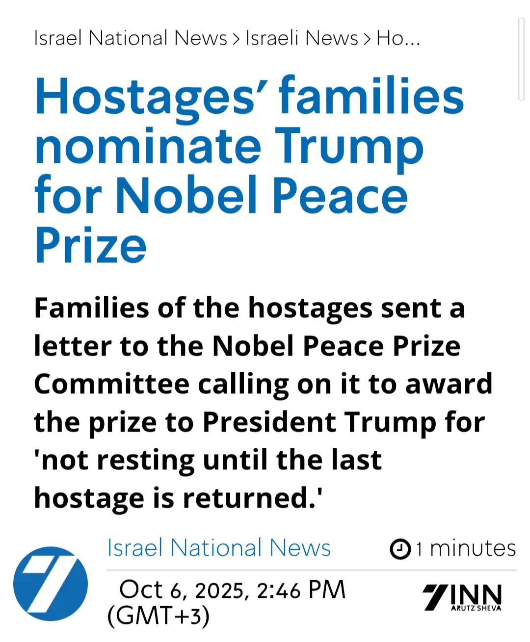 Families of the hostages sent a letter to the Nobel Peace Prize Committee calling on it to award the prize to President Trump for 'not resting until the last hostage is returned.'