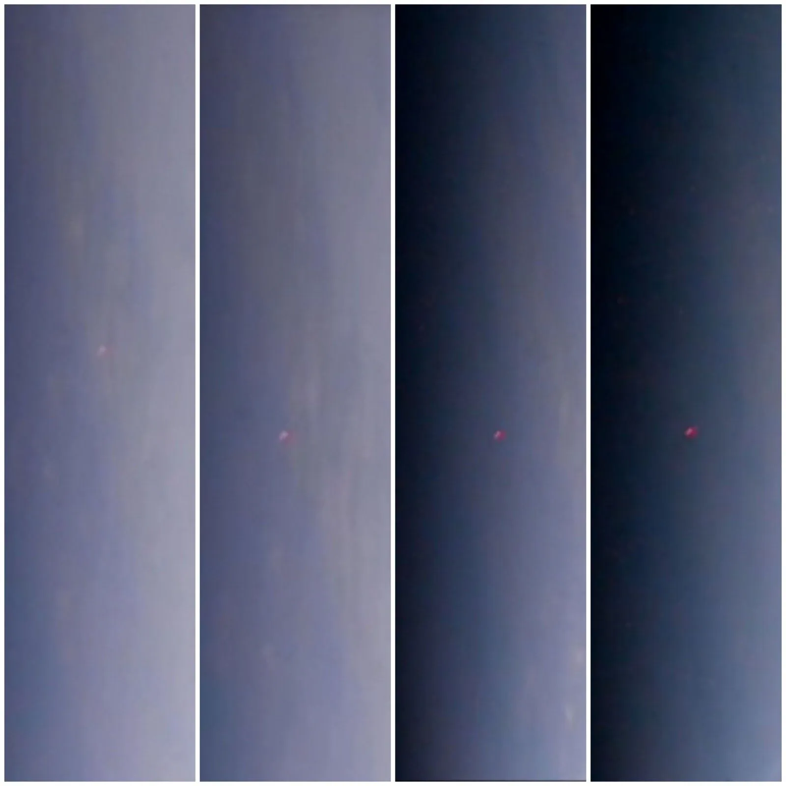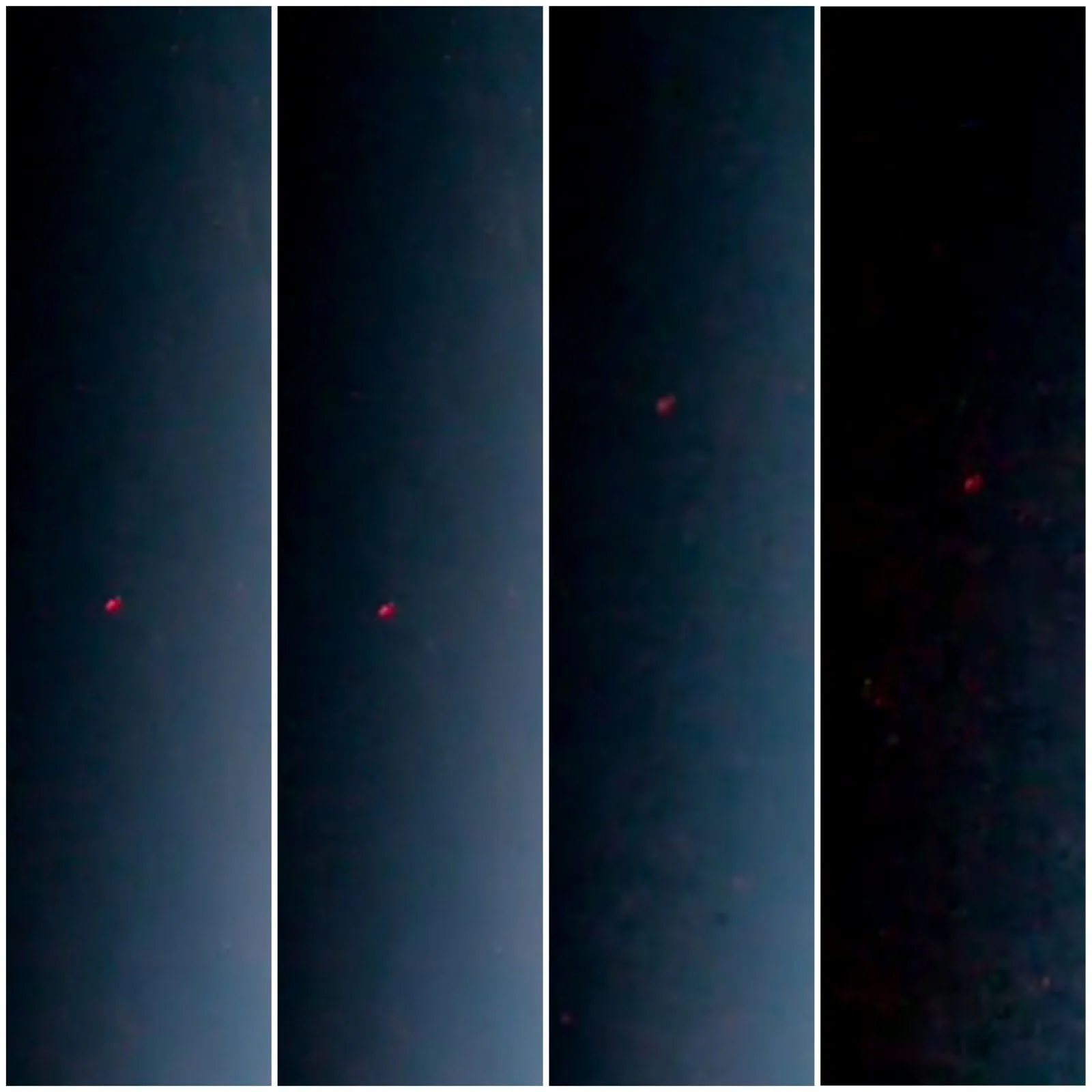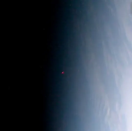 I was watching the ISS camera as it entered the terminator zone at 1:47am-1:50am EST. The red thing appeared and I screen shotted it for 100 pictures or so. Here's a collage of 8 pictures of it when it appeared out of nothing and as the dark side of the earth rolled around. 1 full photo (5/8) for wide observation.