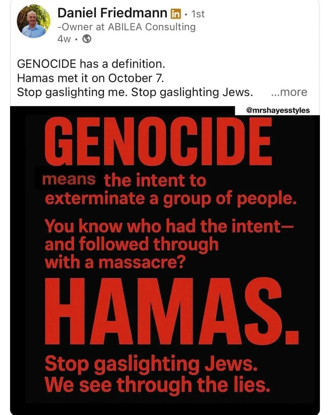 OMG. Another liberal antisemite. Accusing Jews of being like Nazis is a dead giveaway. Another is the targeted hate for the Jewish country and lies about genocide. Another is the lie about “hundreds of thousands.”