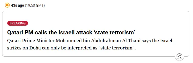 Hard disagree. This was the elimination of Hamas military leaders who ordered (and bragged about) committing an actual terrorist attack against civilians (illegal and immoral) within the context of war. It was in direct response to that event. It was precise and measured and, apparently, effective.This is without doubt coercion of Qatar to cease all involvement ceasefire and hostage release negotiations, that's why they carried out the bombing - it is terrorism.
