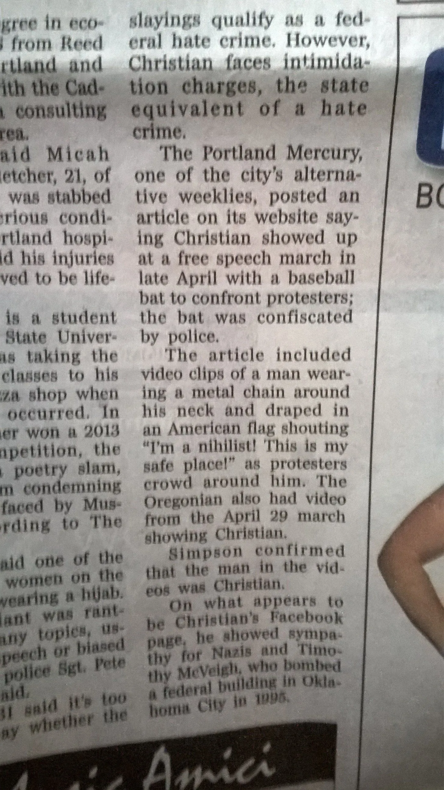 The story in the Register Guard confirms that the alleged "hate speech victims" were preparing to leave the bus and had the vicinity of the guy who told the illegal Muslim to go back home. Then they heard a commotion, looked back and the guy was fighting off two or three idiots who tried to mob him.