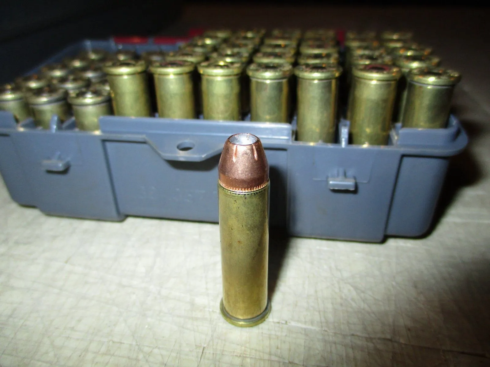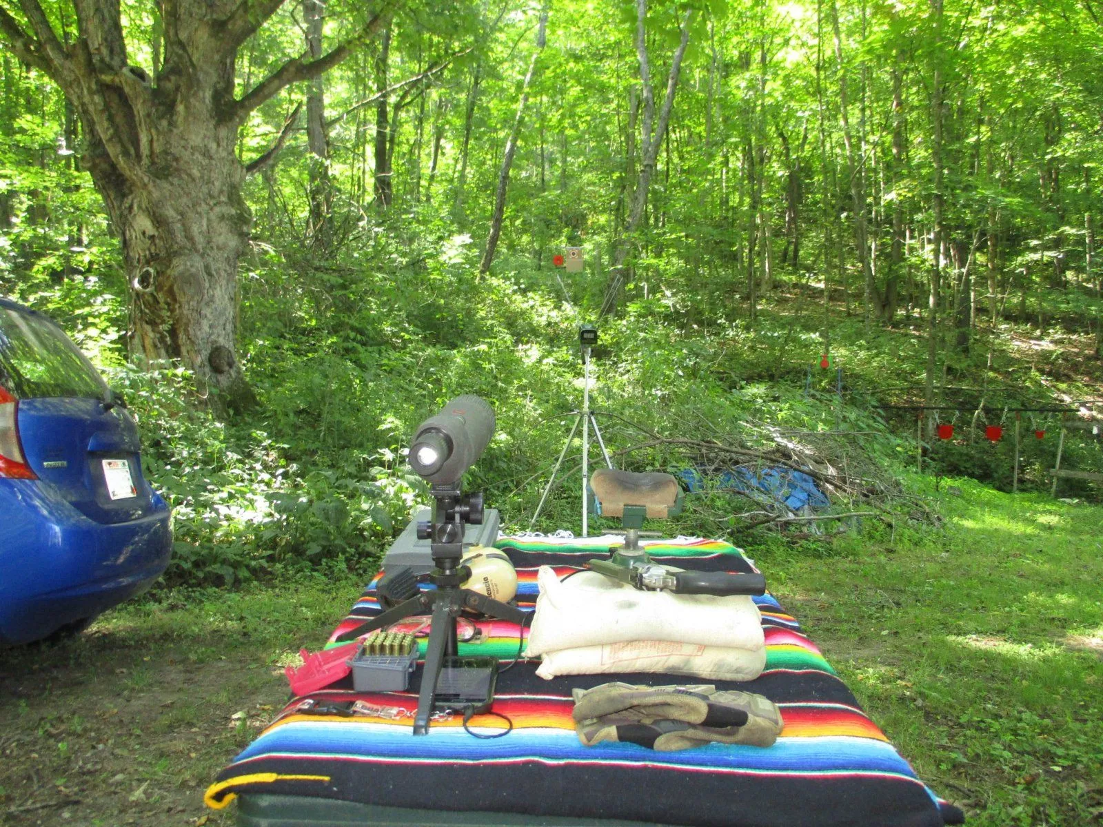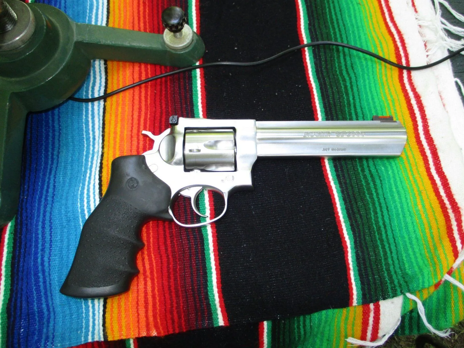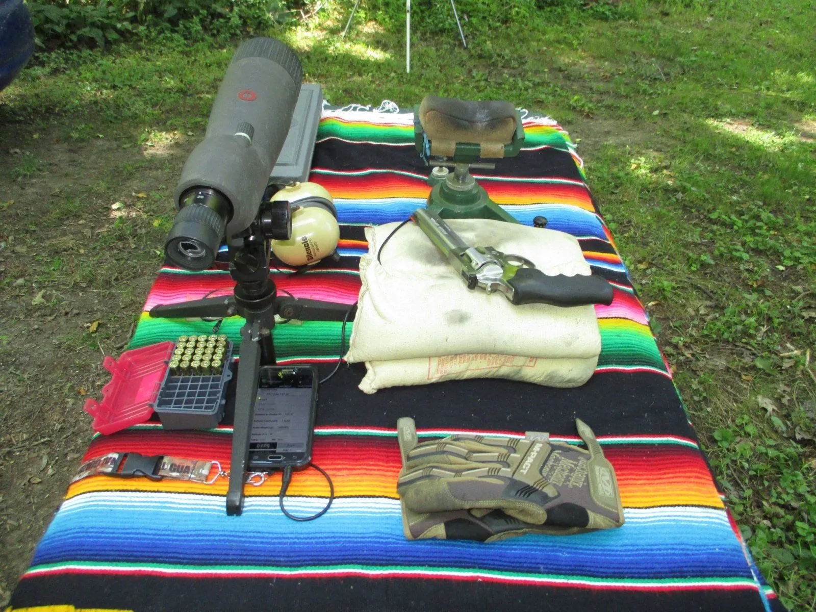 It's 80 degrees with 80% humidity, but there's a little breeze and it's nice in the shade. I figured I'd sight in this 6" barreled Ruger GP100 .357 magnum I picked up earlier this summer. The ammo was handloaded Hornady 140 grain XTP on top of 14.7 grains of Alliant 2400, CCI No. 550 Small Pistol Magnum Primers, and with an overall length of 1.585". They were pushing at an average of 1145 fps measured on a chronograph, which is about 200 fps slower than a commercial load of that weight and style bullet.