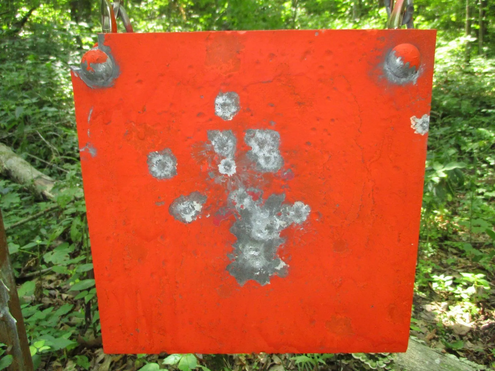 The target was a 16" square piece of 1/2" AR500 armor plate, hanging at a range of 60 yards measured with a laser rangefinder. The strikes low on the target were some 30-06 I was shooting the other day, the ones high on the target were the .357. This is about the best accuracy I can get out of this load, without trying another bullet weight/powder configuration, or putting a scope on the pistol...