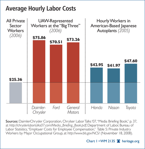 The difference in labor costs between the Unionized companies, verses non-union companies is huge. Which is exactly why GM and Chrysler went bust, while Honda Toyota, and Nissan did not.