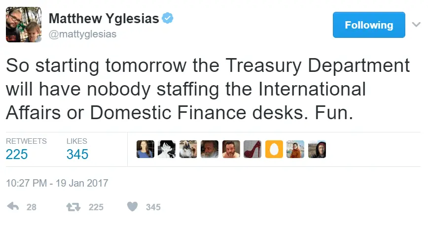 And this: out of 690 positions that must be confirmed by the Senate, Trump has nominated a grand total of . . . 30!