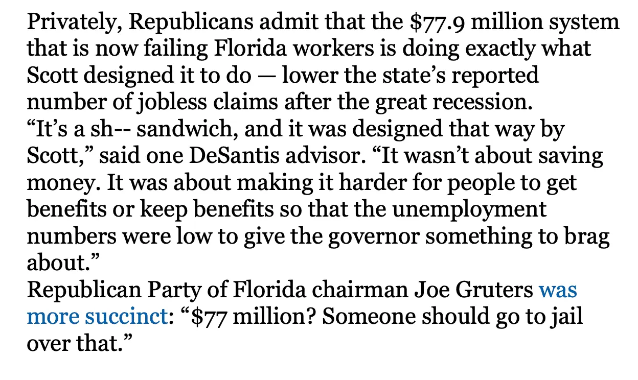 Privately, Republicans admit that the $77.9 million system that is now failing Florida workers is doing exactly what Scott designed it to do — lower the state’s reported number of jobless claims after the great recession.