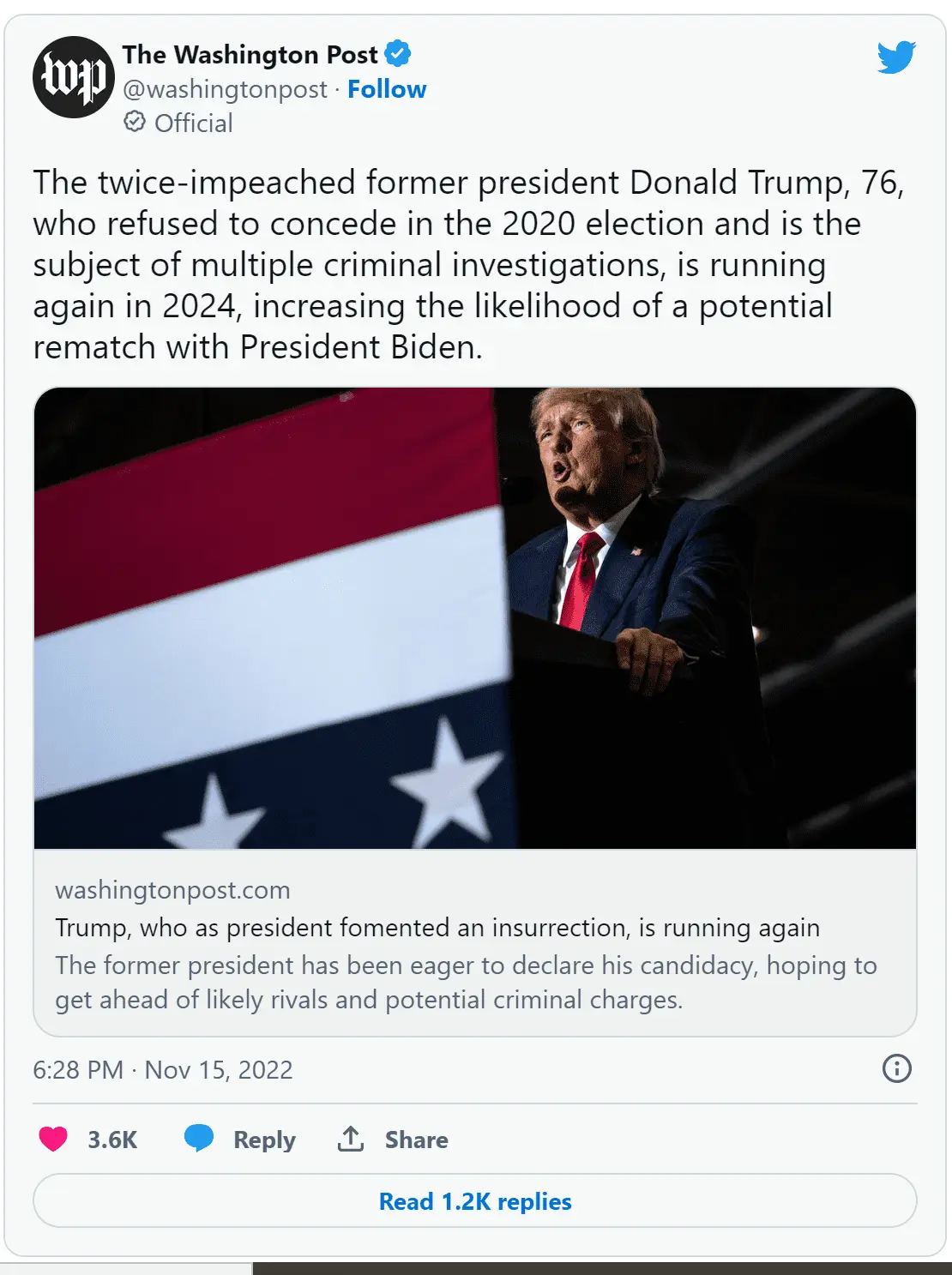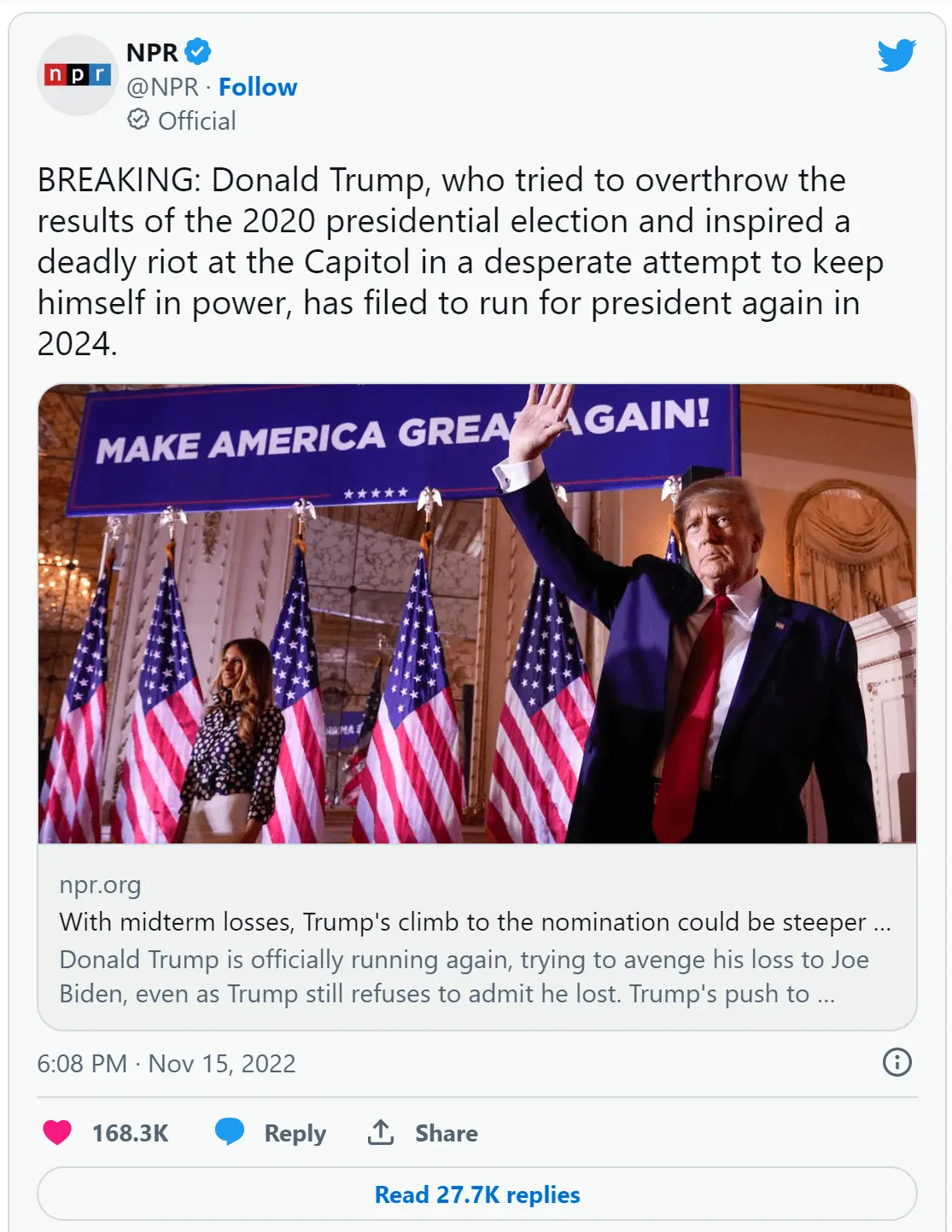 Two years out from 2024 election and the forgone knowledge that Trump was going to run again...like nobody saw that coming.Still nothing from the white house? The media barely covered it as well. At least to my knowledge.