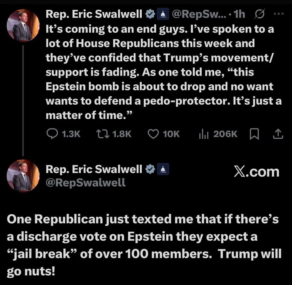 “It’s coming to an end guys. I’ve spoken to a lot of House Republicans this week and they’ve confided that Trump’s movement/support is fading. As one told me, ‘this Epstein bomb is about to drop and no [one] wants to defend a pedo-protector. It’s just a matter of time,’” Swalwell said in a thread on the social platform X.