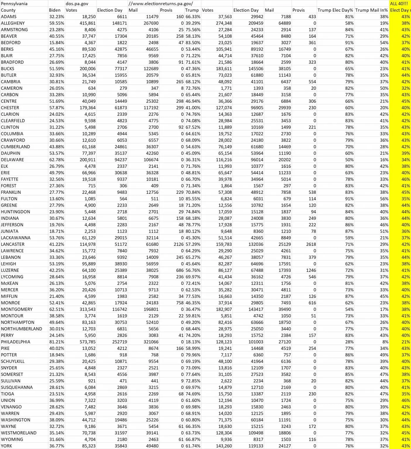 Biden/Dems appear to have received 54% of all mail-in ballots to Trump's 45%.....ON EACH DUMP....HOURS/DAYS APART.....REGARDLESS OF THE AMOUNT OF VOTES IN THE DUMP:Go back to this one and start here: