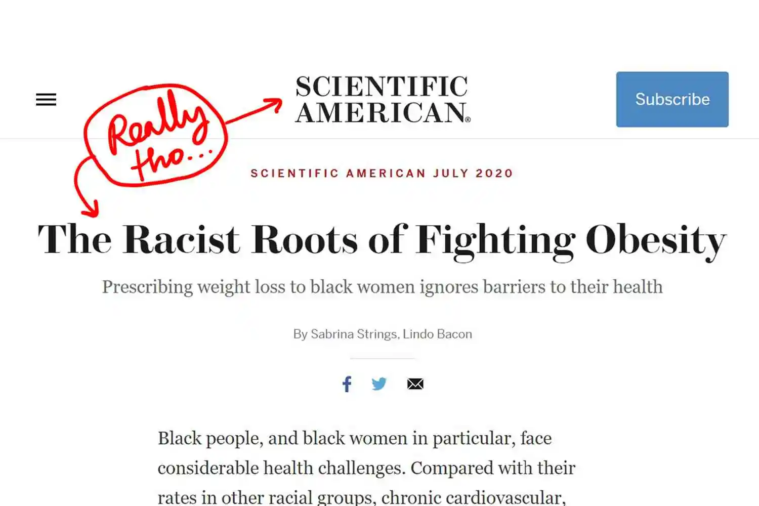 "Doctors often tell fat people that dietary control leading to weight loss is the solution to their health problems." No, they don't. Not THE solution to ALL their health problems. Losing weight, if you're fat, is A solution to MANY health problems. The S.A. author's statement here is false.