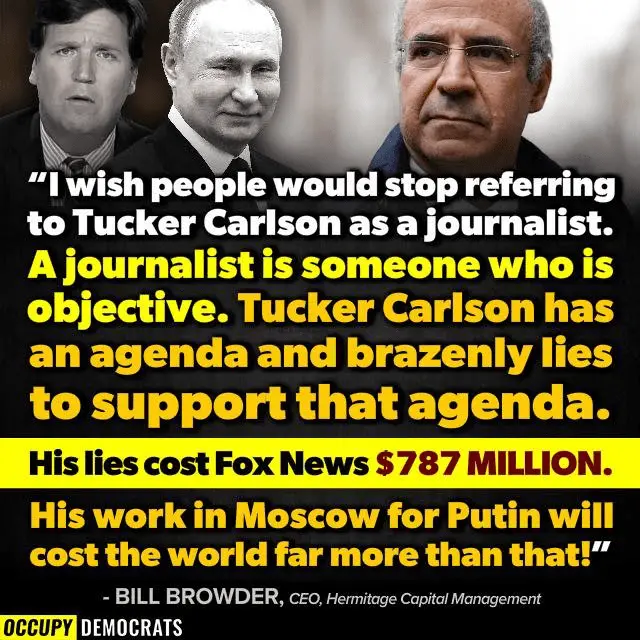 I bet we could sub out Tucker and replace with one of your leftie journalists and you'd be singing their praises, using the exact same questions and answers. I could win a ton of money on that bet, all you know how to be is partisan, if they didn't have a letter after their name, or appear on certain networks, you'd have no clue how to feel about what they say. Sad truth.