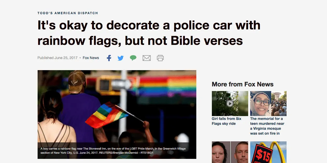 It’s permissible in the United States to decorate police cars with rainbow flags to celebrate gay pride, but it’s not permissible to decorate police cars with Bible verses honoring law enforcement officers.