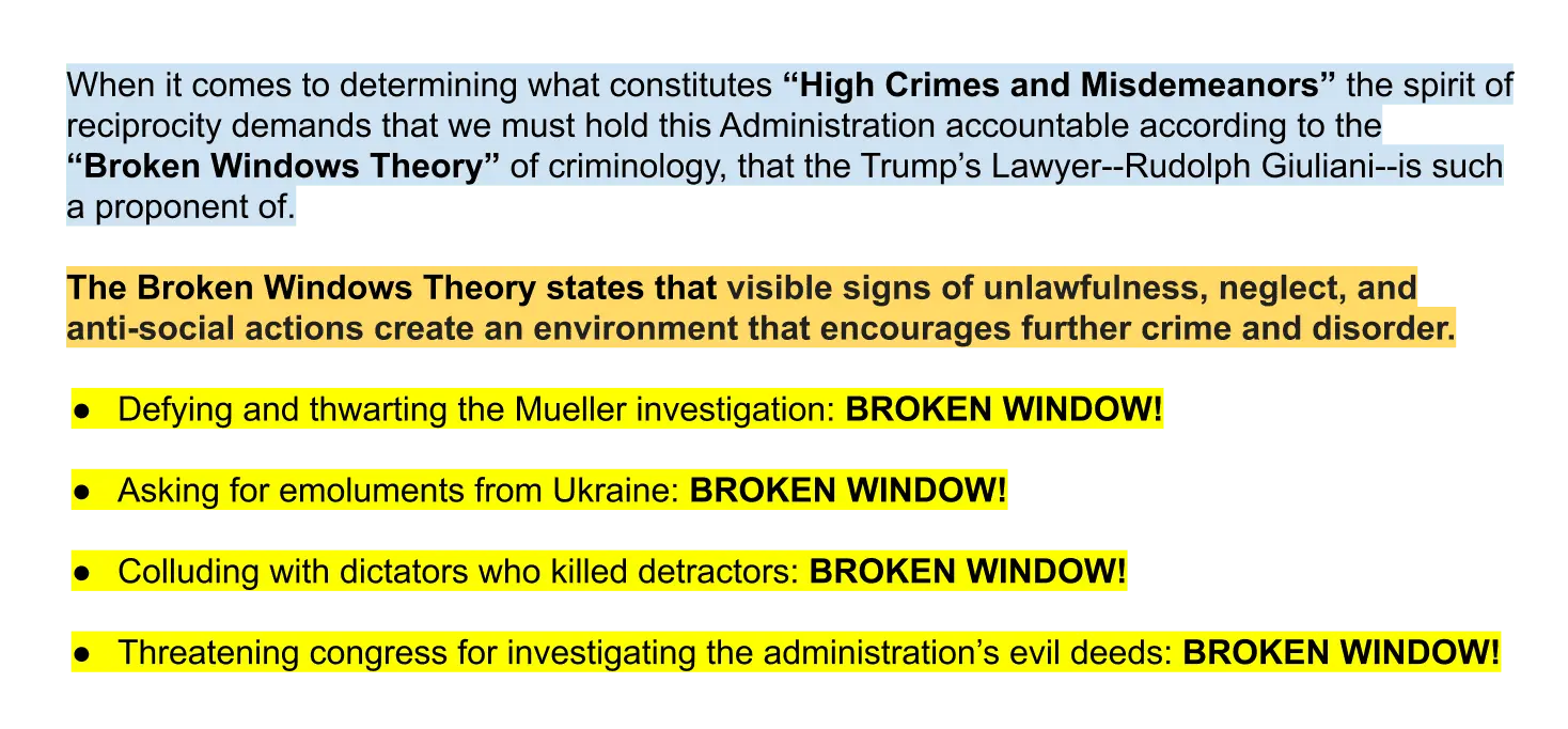 This is why Obama should have been impeached. Looking in to Obama's, Clinton's and Biden's Criminal Behavior after it was discovered in an official ongoing investigation is perfectly legal.The president's job is to set policy and delegate tasks to the appropriate agency.You assume Trump was asking for dirt on a political opponent and not just performing his oath to uphold the law which way too many seem to have broken.Lets say that Obama had reached out to Iran for help in finding dirt on Trump in an effort to discredit him during the 2016 election and give Hillary the edge.Proving guilt, especially conspiracy, is a tough nut to crack but if there is a leak or two watch for the dam to break and a flood of guilty scumbags scrambling to make a deal.The indictments are coming. Mueller had 2.5 years and $40m to spend investigating Trump. I believe that Barr and the DOJ will hand down indictments after their investigations are complete. Huber, Durham, and Horowitz are all investigating, it takes time to obtain all the evidence. If there are no indictments by Xmas then I'd agree with you that indictments are probably not coming.