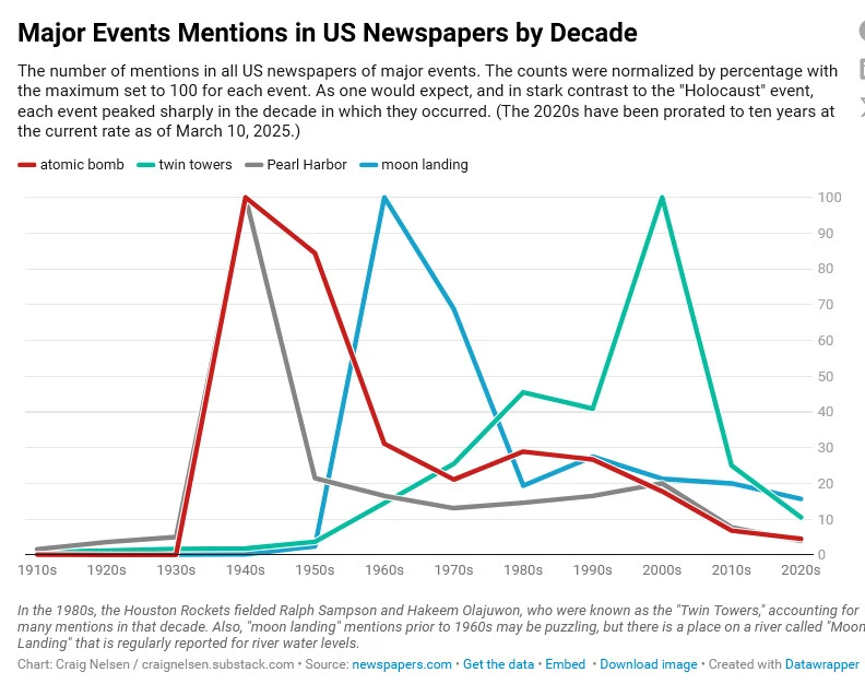 I went to the website, newspapers.com, and searched for the number of mentions in US newspapers for phrases related to four major events: “atomic bomb” (for the US use of atomic bombs on two Japanese cities in 1945), “twin towers” (for the 9/11 attacks in 2001), “Pearl Harbor” (for the Japanese attack on the US Navy in 1941), and “moon landing” (for the Apollo 11 mission in 1969).
