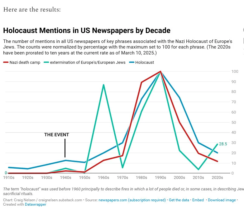 Then I did the same for four phrases that would be associated with the Holocaust: “Holocaust,” “Nazi death camp,” and “extermination of Europe’s Jews,” which I combined with the results from a separate search on “extermination of European Jews.”