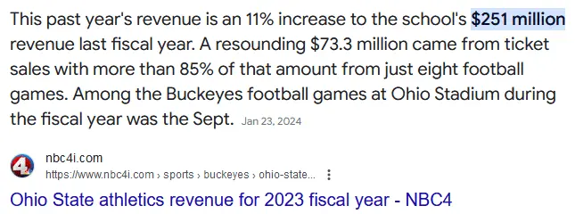 Of course they probably made similar amounts in 2022, 2021, 2019, 2018, 2017..... Strange how that money never finds its way into lowering tuition costs. I'm signaling out the SuckEyes because, well, they're they SuckEyes...but the same thing happens in nearly every state that has one of these "indispensable" football teams at their PFU. Thankfully a lot of states just have one of them.