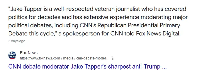 There is zero percent chance you'll believe the debate will be fairly moderated. We have a 50 year public servant vs. a convicted felon. I don't envy them their task. I mean, if Biden were debating Jeffery Dahmer, would you expect Tapper and Bash to not mention Jeffrey's penchant for decapitating folks?