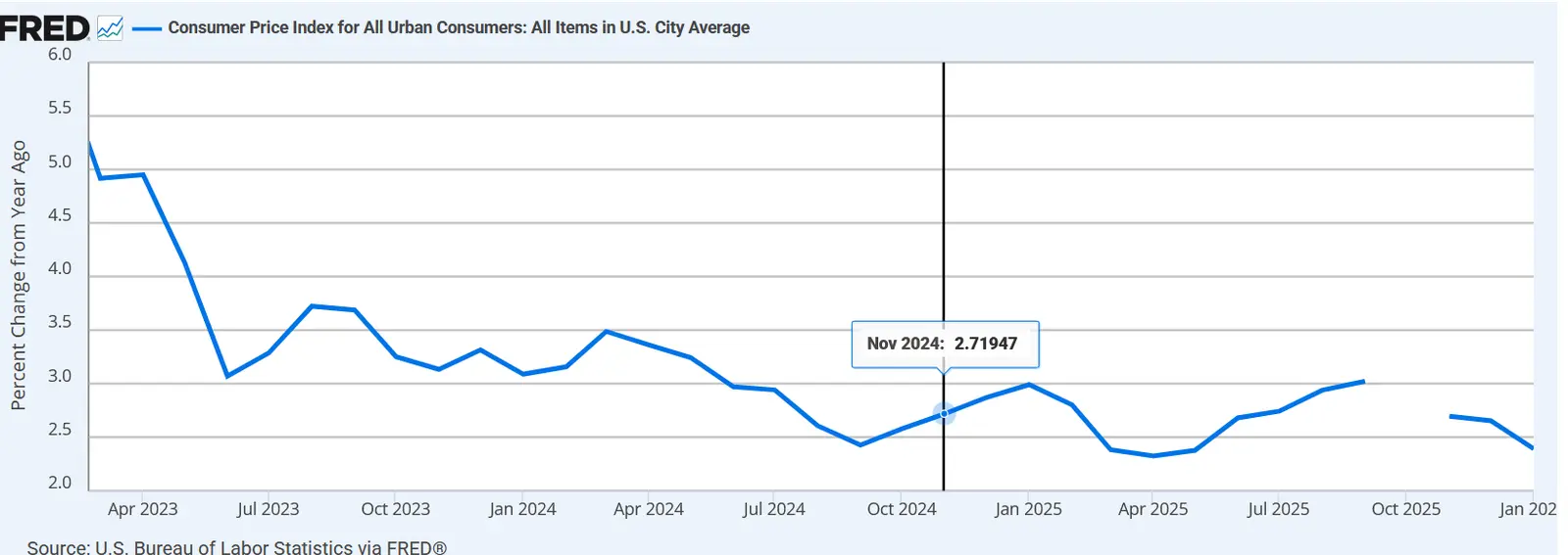 Inflation dropped to 2.4% in January compared with a year earlier, down from 2.7% in December and not too far from the Federal Reserve's 2% target. Core prices, which exclude the volatile food and energy categories, rose just 2.5% in January from a year ago, down from 2.6% the previous month and the smallest increase since March 2021.