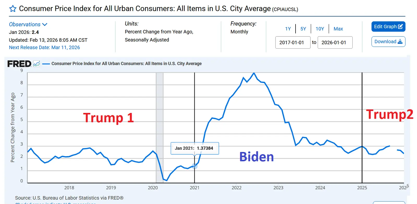 Inflation was 2.4 on election night in 2024. It was 9 percent for a short time due to COVID. If Trump had been president in 2021, it would have been 9 percent for him. What you dishonest right-wingers need to do is stop talking about a few months as if it was all 4 years. Finally, it is unwise to believe anything produced by this administration.