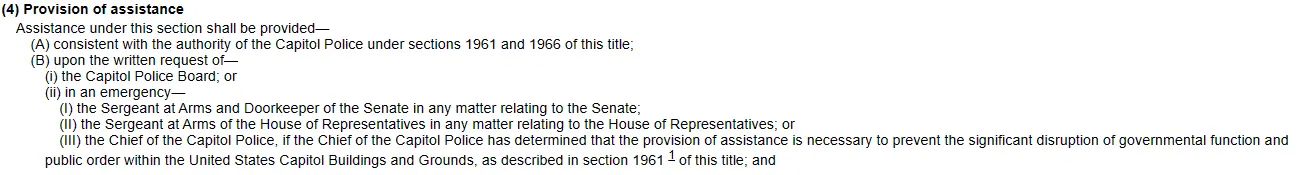 Assistance by the Executive departments is the President of the USA. It must be written, or in the case of a declared emergency the written authorization is in the, Emergency Plan to Protect the Capitol.Before making a request under this paragraph, the Capitol Police Board shall consult with appropriate Members of the Senate and House of Representatives in leadership positions...