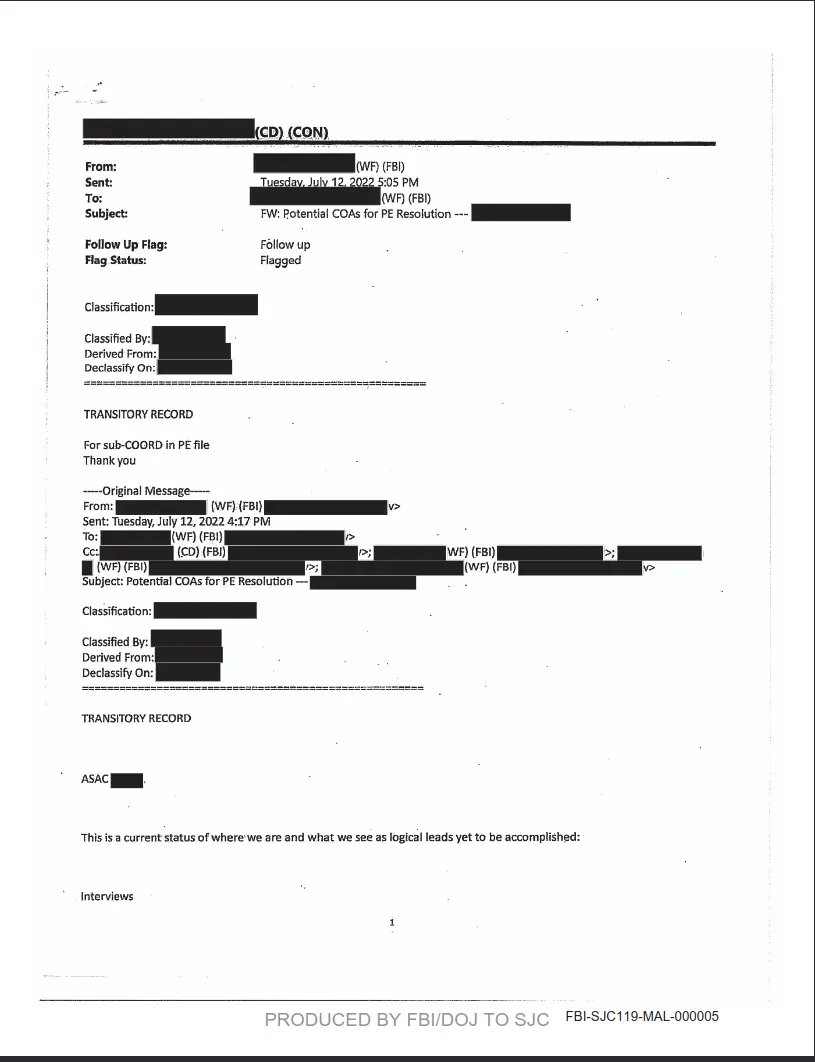 “This event is dependent upon the timeline of President Biden’s brief, decision, and coordination between WH Counsel and DOJ,” an unidentified FBI official wrote in a May 10 email to others in the bureau’s Washington Field Office.
