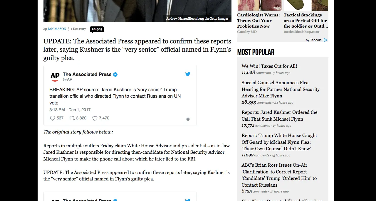 UPDATE: The Associated Press appeared to confirm these reports later, saying Kushner is the “very senior” official named in Flynn’s guilty plea.