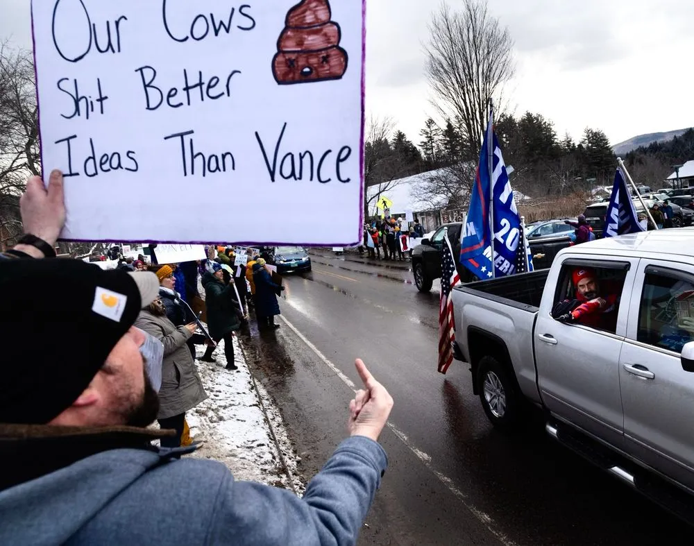 The crowd shouted furious insults at the second-in-command. People held signs with harsh words against Vance, such as "Nazi scum" and "go skiing in Russia."