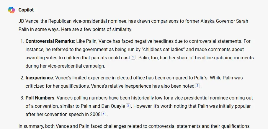 Palin had every chance in the world. She was just too stupid to take advantage of it. Vance was given an equal chance, but he is blowing it with stupid remarks about cat ladies and his on again off again romance with a couch cushion.Progs went on a search and destroy mission on Palin. McCain phoned the campaign in as he partied his ass off. Unlike Harris, Palin was never given a chance.
