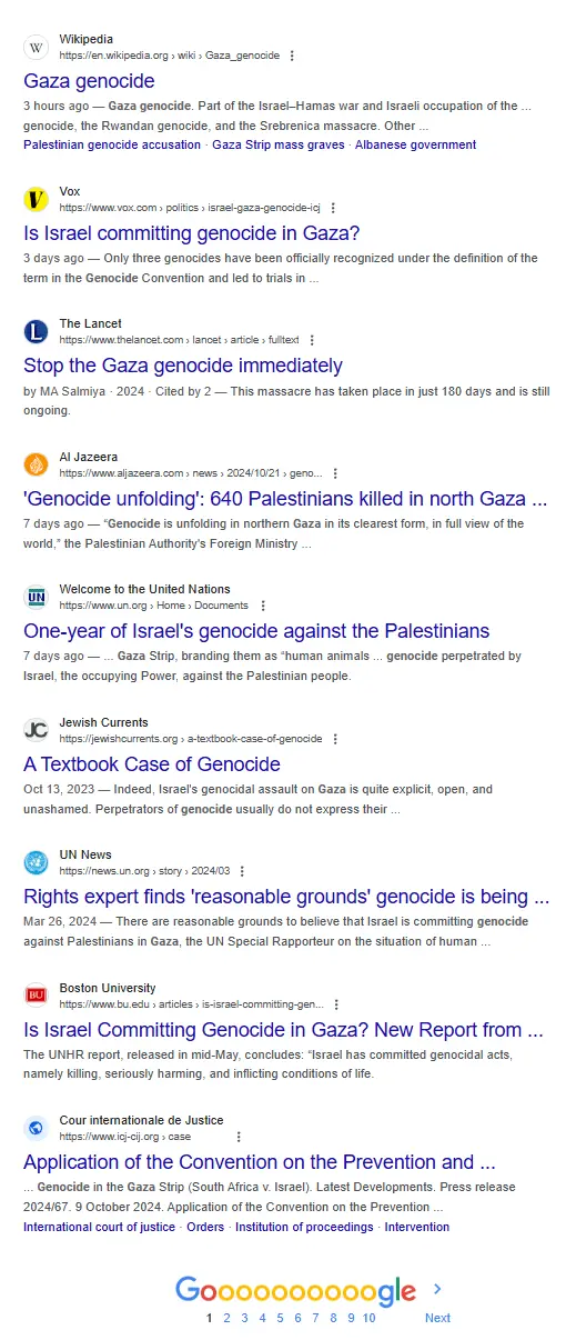 If Israel wanted to commit genocide there would be no Palestinians in Gaza or the West Bank today.Here's the first page of results, all of these are lying? anti Israel propaganda?