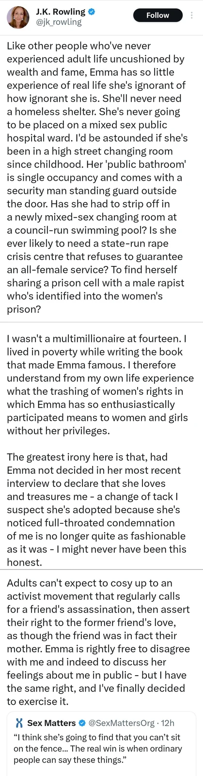 Funny how entitled white women love to play victim. Emma attacked JK for being a “transphobe” for so long. Apparently she’s trying to walk it back since there is so much blowback against woke nonsense (Thanks President Trump win). But JK wasn’t having it, and called her out for the insufferable petulant child she is.