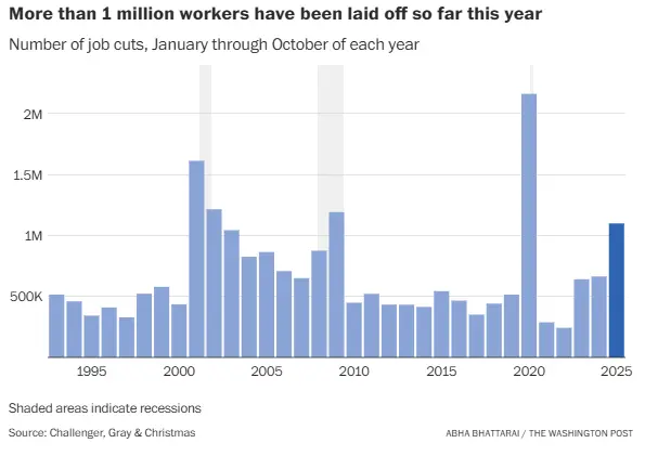 Layoffs accelerated in October, pushing 2025 job cuts to levels typically seen in recessions, according to newly released data from Challenger, Gray & Christmas, a private firm that tracks workplace reductions.