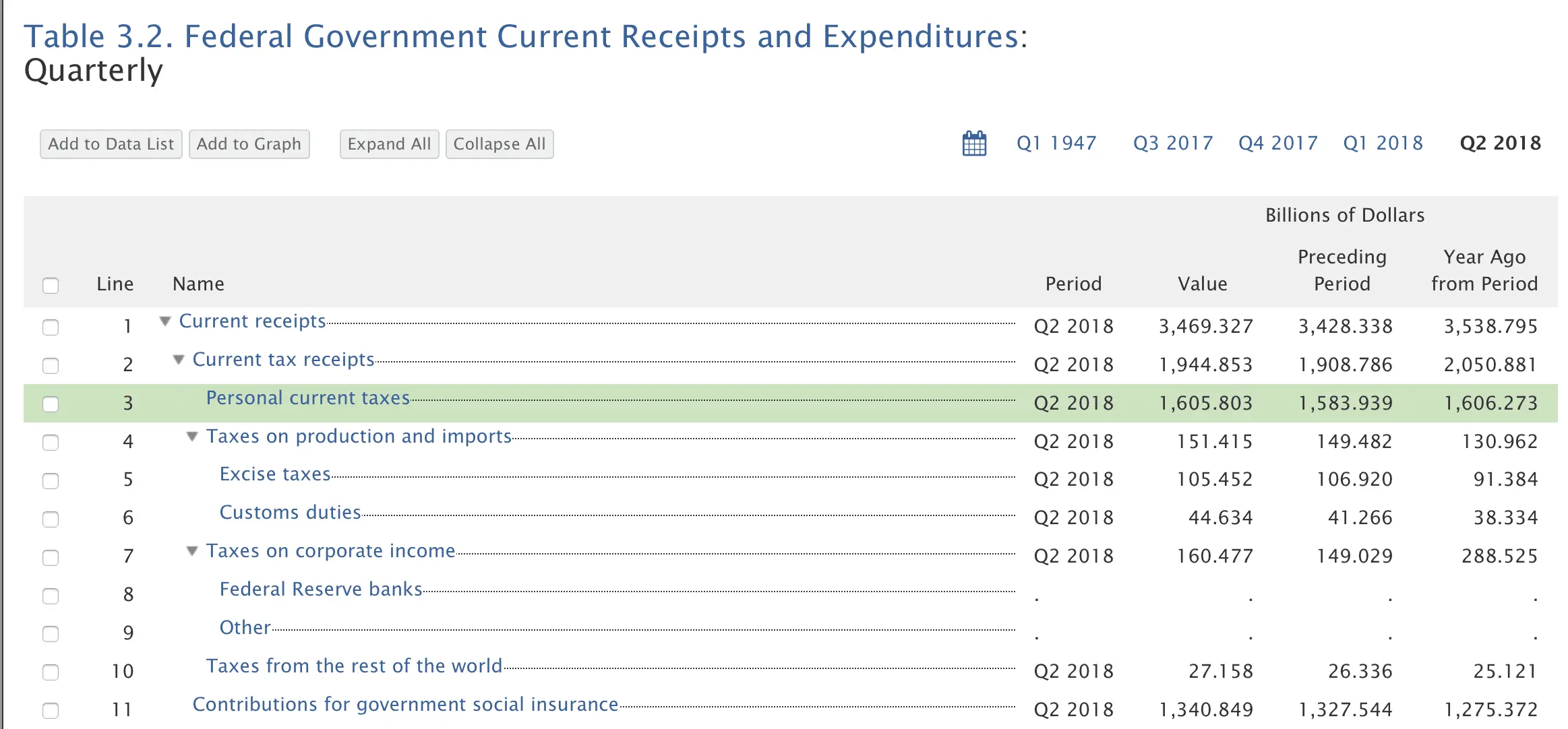 Q2 2018, Table 3.2. Federal Government Current Receipts and Expenditures: Quarterly | FRED | St. Louis Fed