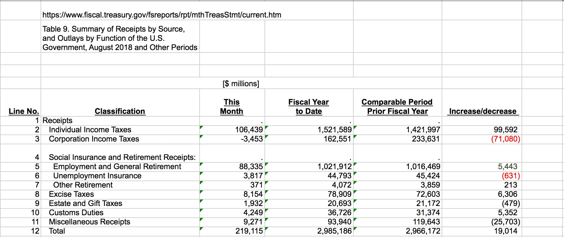 Table 9. Summary of Receipts by Source, and Outlays by Function of the U.S. Government, August 2018 and Other Periods