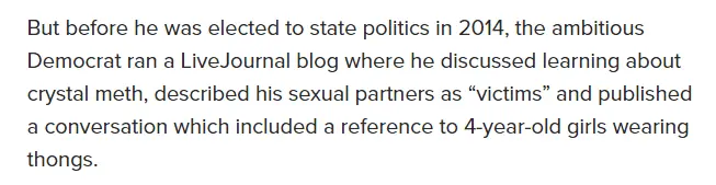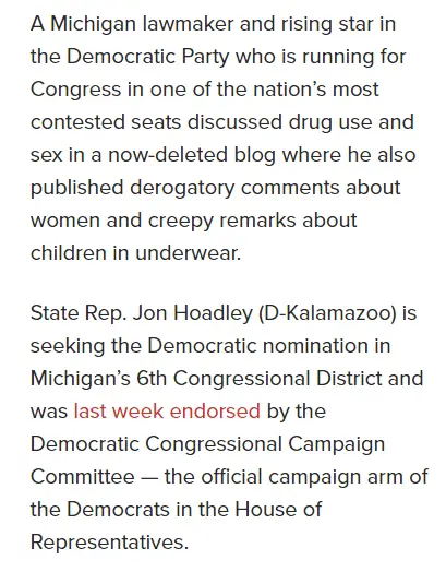 Well NORMAL peoples will NOT be shocked to know that Joe Biden and Kamala Harris have endorsed a weird creepy and possibly Meth Head Pro-Pedo freak in Michigan who is running for US Congress who has blogged about 4 year old girls wearing thongs. The Party of The Depraved and Oddball Misfits just goes lower and lower down the sewer.