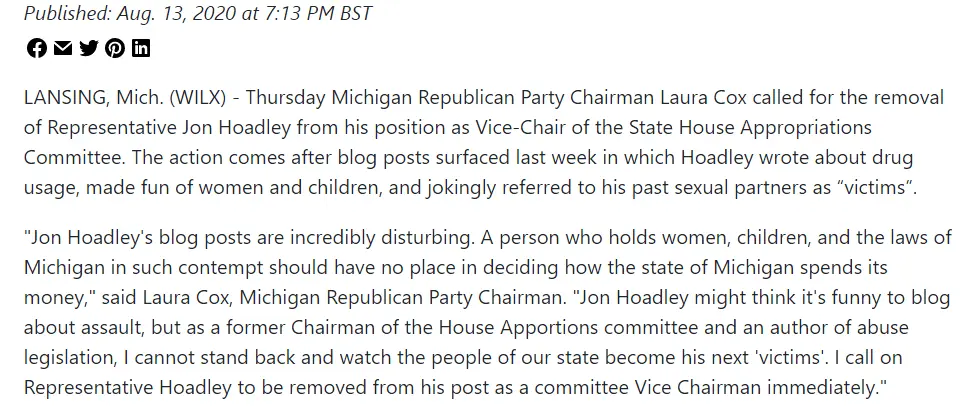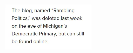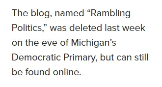 ^^^^ The Leftists aka Communists aka Michigan Democrats deleted his blog about doing Crystal Meth, thinking about 4 year old girls in thongs and describing his sexual prey as VICTIMS, good thing this crowd have the IQ of a paper cup and DON'T know you can NEVER DELETE things because SOMEONE will have ALREADY lifted it in advance KNOWING you are PROBABLY going to ATTEMPT to remove the potentially incriminating evidence against yourself.