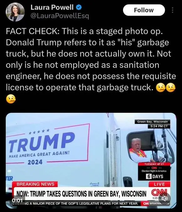 Just about everyone knows what Trump does for a living. Trump has no need of a class B CDL and is not in the driver's seat where he would need one. Of course this photo op is staged. Again not new information. And the garbage truck is likely rented for the Photo-op...but that doesn't make it any less his for the day or week or month that he has rented it for...