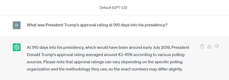 39% according to MSNBC. To put that into perspective, around 910 days into GW's presidency, his overall approval rating ranged from around 50% to 60% in various polls. And at 910 days into Donald Trump's presidency, his approval rating averaged around 43-45%.