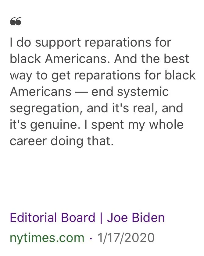 BIDEN: "I support us going out and doing a study ... whether there should be cash payments, what should happen."