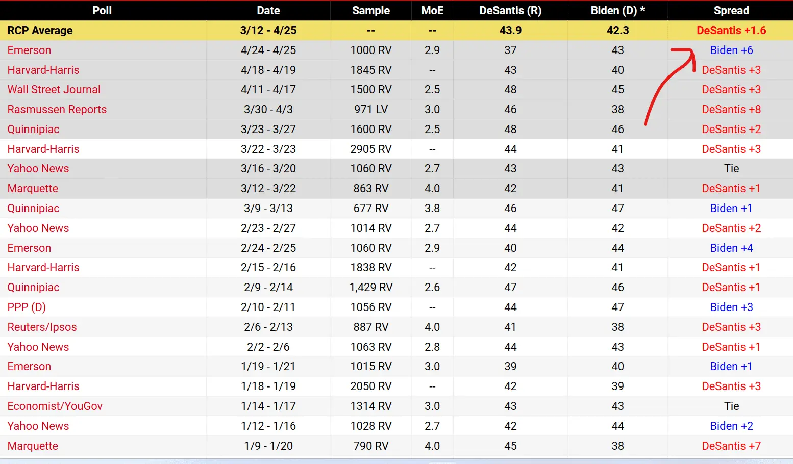 In one poll.View attachment 780251So far Desantis had been dominating Biden. Looks like Desantis' recent extremist 6-week law in Florida, or Trumps attacks on him, or both, have given Biden the edge.