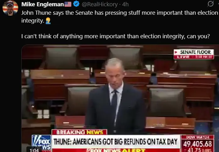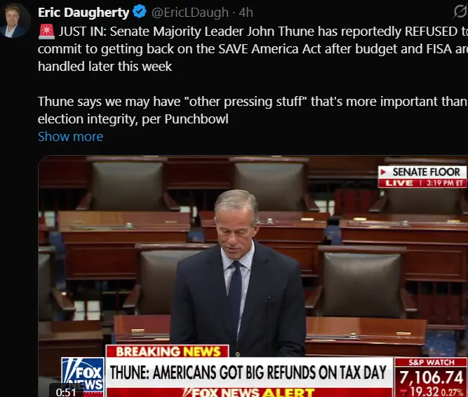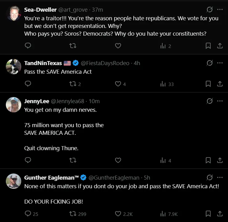 John Thunes refusal to push for the passing of the SAVE Act is making him REALLY unpopular with American voters. Luna: " no SAVE then no FISA"