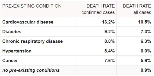 "Patients who reported no pre-existing ("comorbid") medical conditions had a case fatality rate of 0.9%. Pre-existing illnesses that put patients at higher risk of dying from a COVID-19 infection are:
