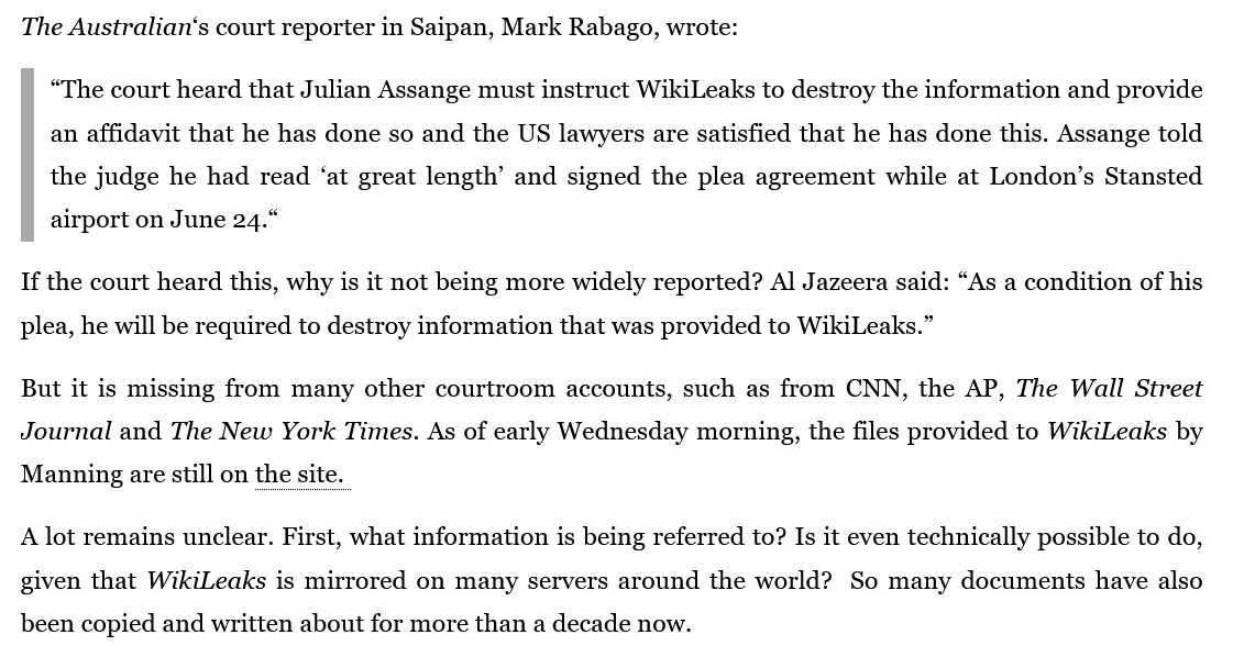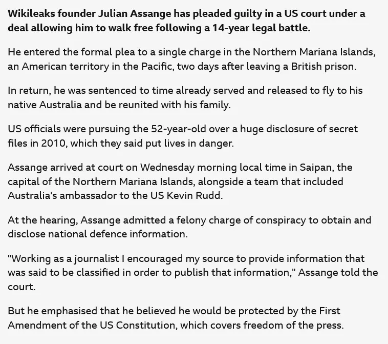 The New York Times reported that Assange agreed to the one count of the Espionage Act — “conspiracy to disseminate national defense information” — in exchange for a five year sentence, which the U.S. agreed had already been served on remand in Belmarsh. . .. .. "