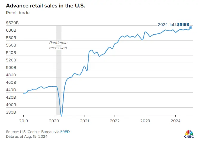 Half of that spending is on credit which means it has a very dark future. Also we could actually use a brief recession to strengthen the dollar. Continuously leveraging the next step of progress at the cost of the monetary unit has a predictably morbid end in sight.Well it looks like the consumer is spending comfortably. July sales beat forecasts without being so good to spike inflation fears. Call it the goldilocks report for being 100% perfect. Stock market shot up 400 points on the reporting.
