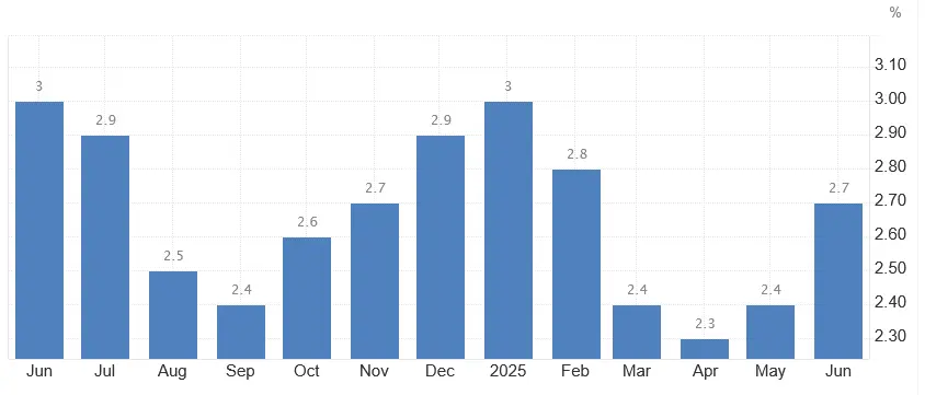 June 2025 inflation 2.7%, up 0.3% from 2.4% in May, as per expectations.