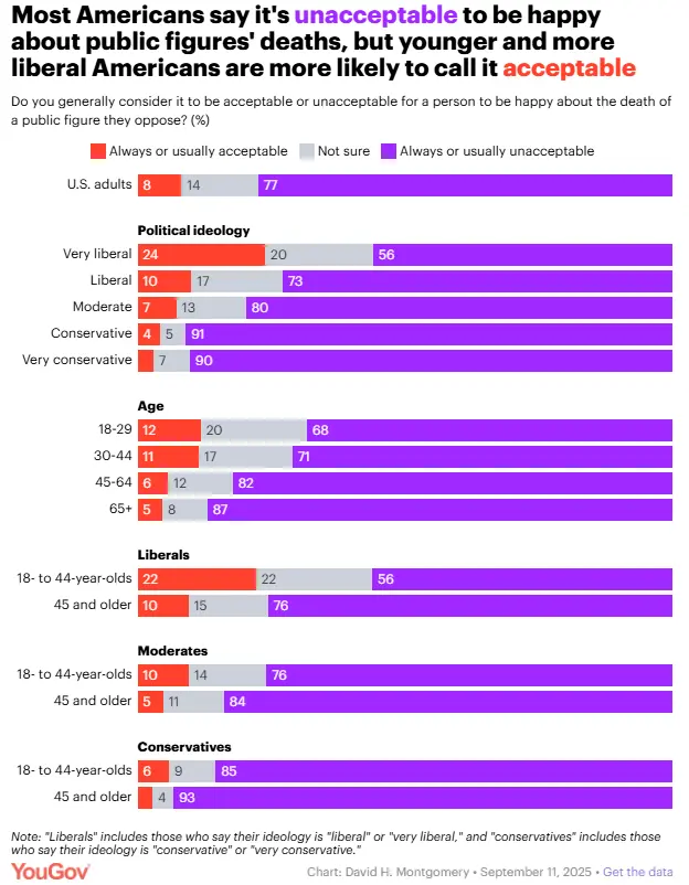Most Americans say it's unacceptable to be happy about public figures' deaths, but younger and more liberal Americans are more likely to call it acceptable. Contrast that with 85% of young conservatives saying it's unacceptable. This isn't surprising to me seeing the number of Gen Z aged leftists celebrating the death of Charlie Kirk on social media, but it's a serious problem that needs to be addressed. How has this group in particular become so desensitized to the idea that it's okay to murder people with differing viewpoints?