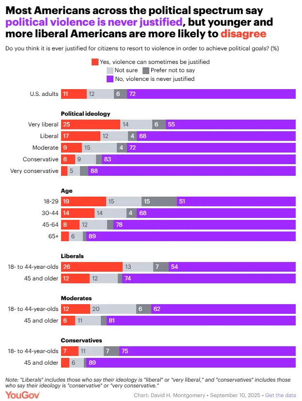 Only 54% of younger liberals say political violence is never justified, whereas 75% of young conservatives agree with that statement.