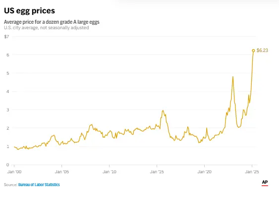 U.S. egg prices increased again last month to reach a new record-high of $6.23 per dozen despite President Donald Trump’s predictions, a drop in wholesale prices and no egg farms having bird flu outbreaks.apnews.com