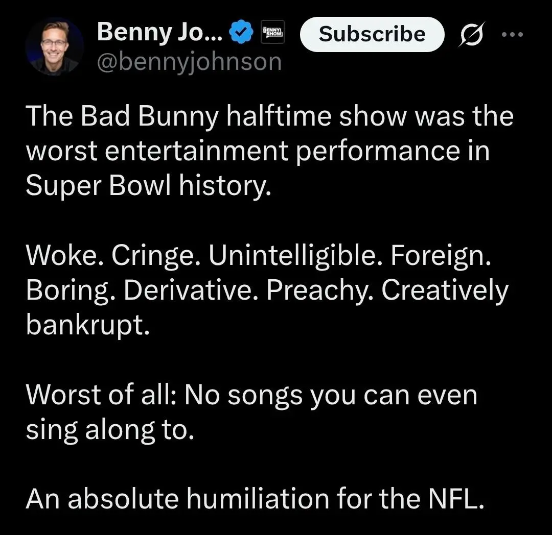 ...What made the situation worse was how politicized the performance became—though not by conservatives. The politicization first came from the left, which treated the selection itself as a cultural statement. That framing turned the halftime show into a symbol rather than a celebration."